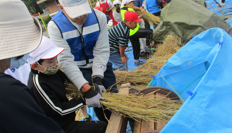 3年生が、総合的な学習の一環で、昔の道具を使っての、自分たちが刈った米の脱穀