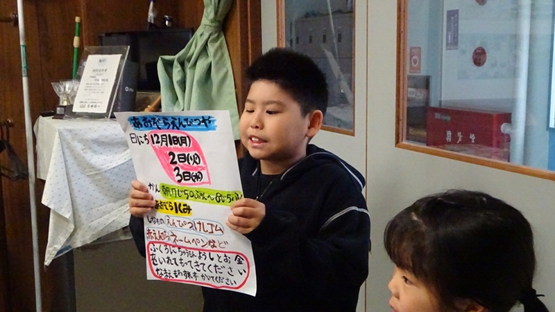 あおぞら1組が「心のとも運動」の取組として、「えんぴつ屋さん」の活動をしました。心のとも運動について、各学級や職員室にお知らせに行ったり、放送で説明したりして、運動編の協力(文房具の購入)を呼びかけました。