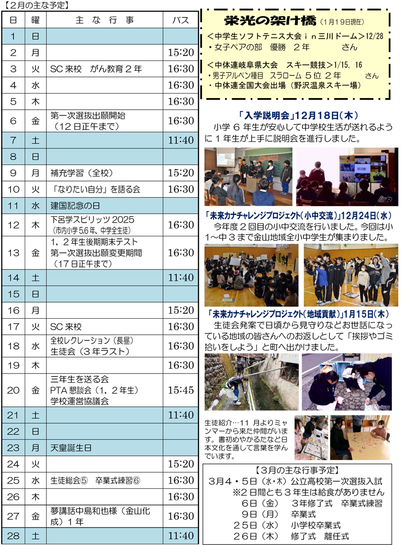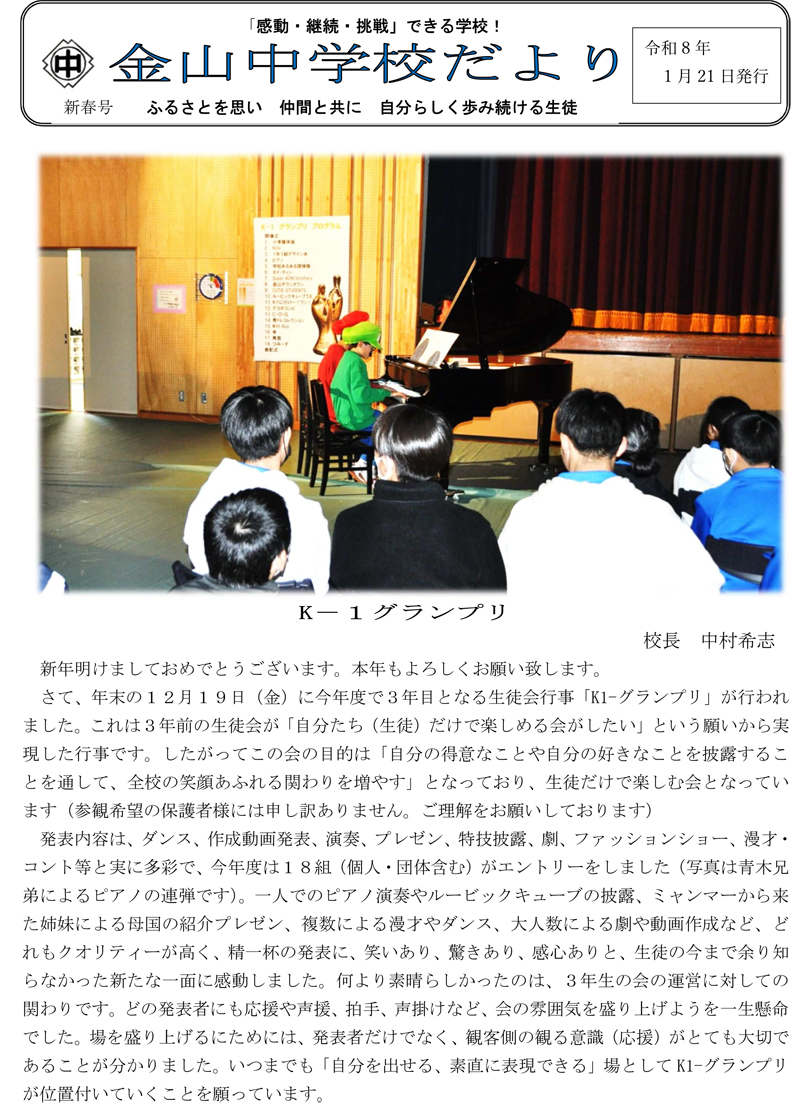 金山中学校だより1月号