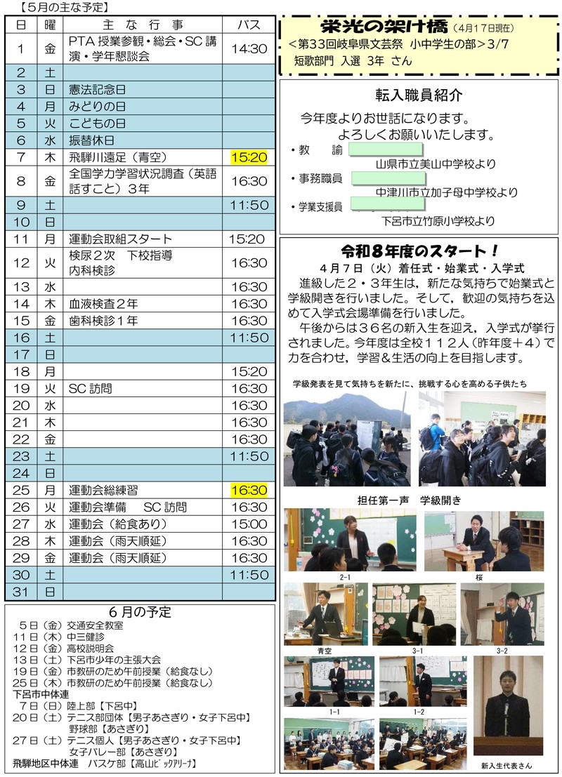 金山中学校だより4月号
