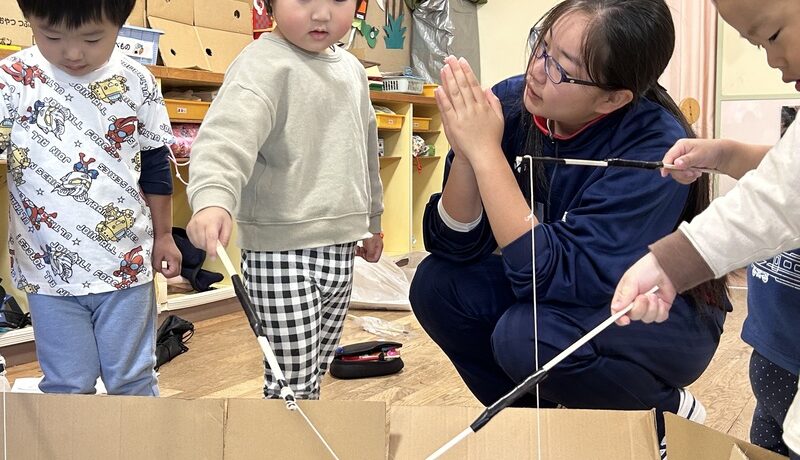 3年B組も家庭科の学習の一環として、わかばこども園で保育実習をしました。作ったおもちゃや外遊び