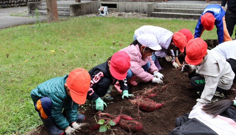 10月22日(水)、1年生と2年生があるに植えたサツマイモの収穫をしました。土が