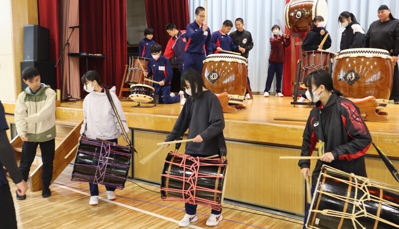 2時間目、2年生とE組の生徒対象に太鼓のワークショップが行われました。実際に様々な太鼓