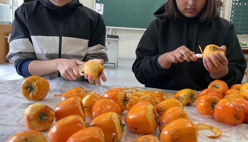 大量の渋柿が学校に届いたので、かけはし教室(日本語教室)で、干し柿作りをしまし