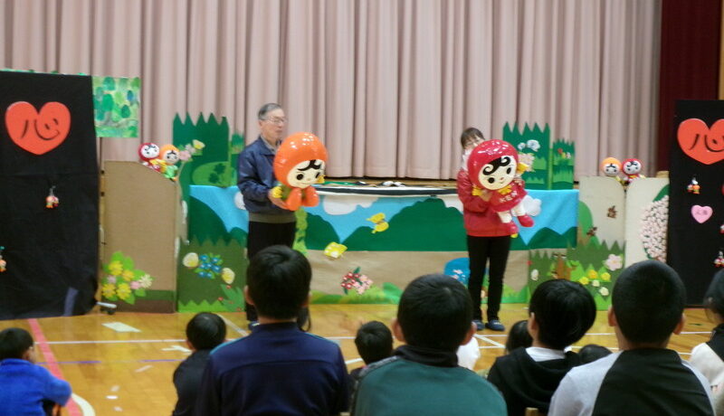 全校で人権人形劇を見ました。オオカミの涙という劇を通して、みんなで仲良くすることの大切さや