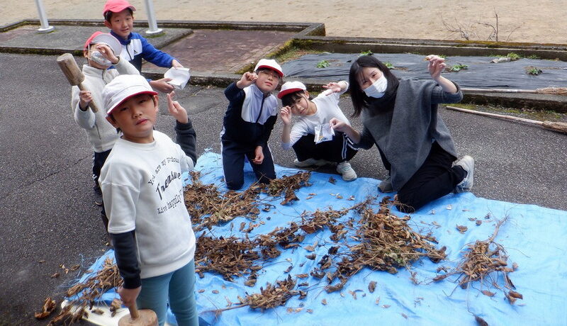 12月17日(水)、少し肌寒い日でしたが、子どもたちが刈り取った枝から大豆