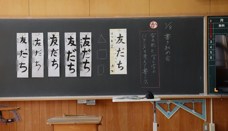 1月8日(木)、雪が積もる中、全校の子どもたちが元気に登校してきました。さっそく書き