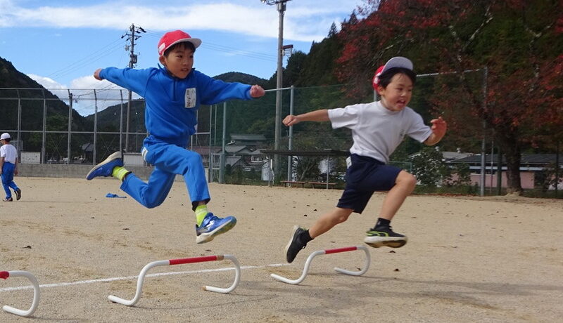 3年生がミニハードル走をしていました。ハードルとハードルの間隔を4m