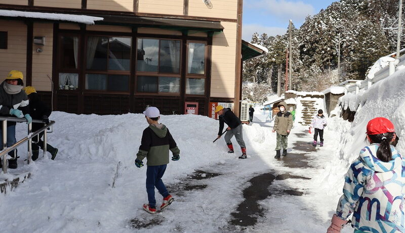 写真は、雪の降りしきる朝、学校の玄関での子供たちの様子です。いつも高学年の