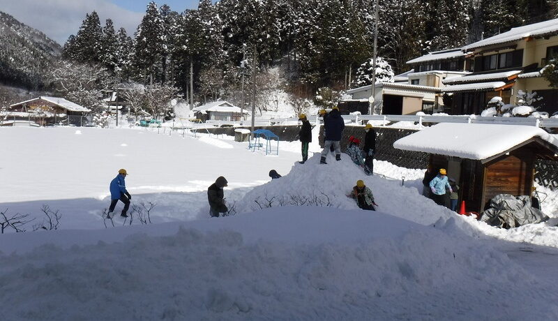 休み時間になると、子どもたちは元気に外で遊んでいます。雪よけで積み