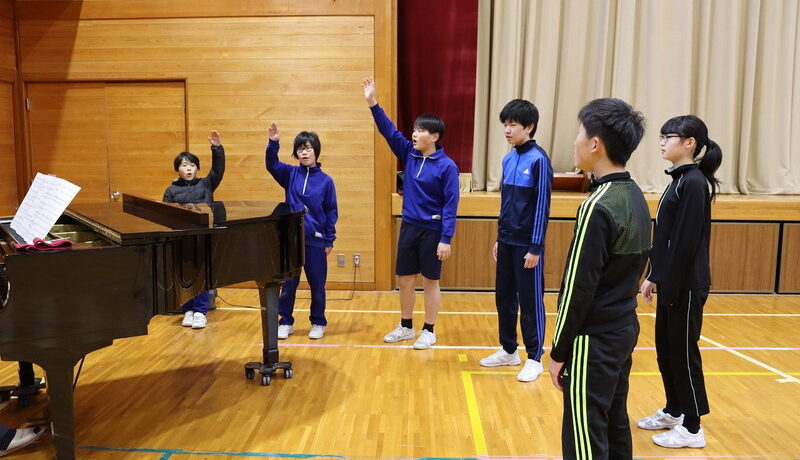 6年生の合唱指導に、馬瀬小学校を卒業し、現在、萩原北中学校に勤務してみえる 中