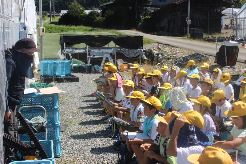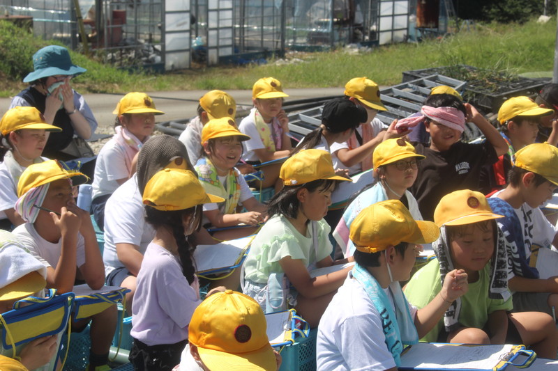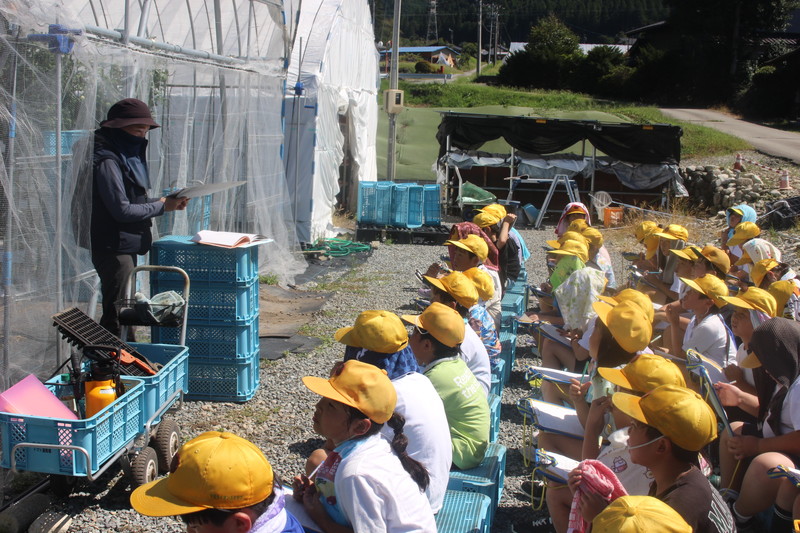 子どもたちは、ビニールハウスの中での工夫や栽培の様子を見せてもらったり、お話を聞いたりする中で、トマトづくりに込められた農家の方の思いを学ぶことができました。