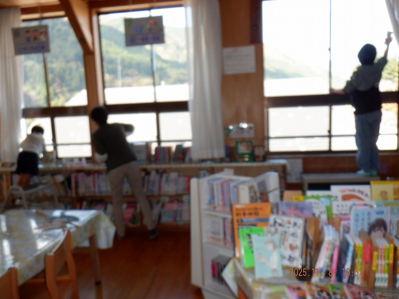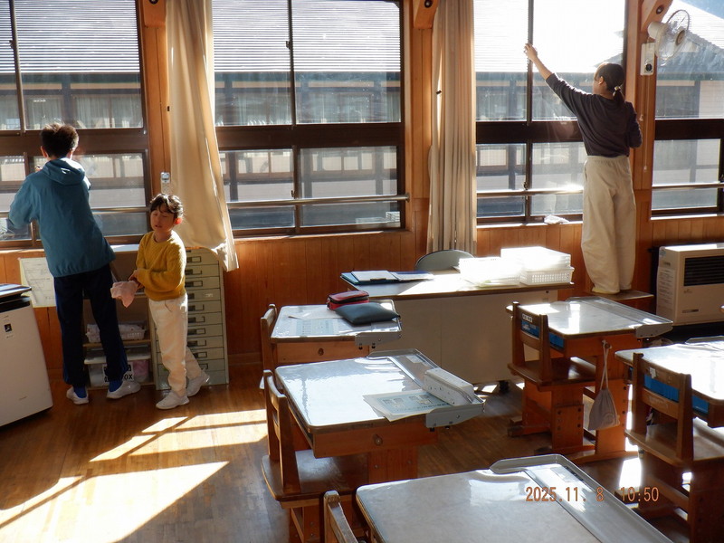 ・子どもたちも一緒になり、窓ふきや床磨きをしました。