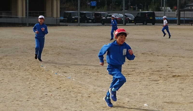 3年生の体育「ペース走」の様子です。4分間に運動場のトラックを何周走る